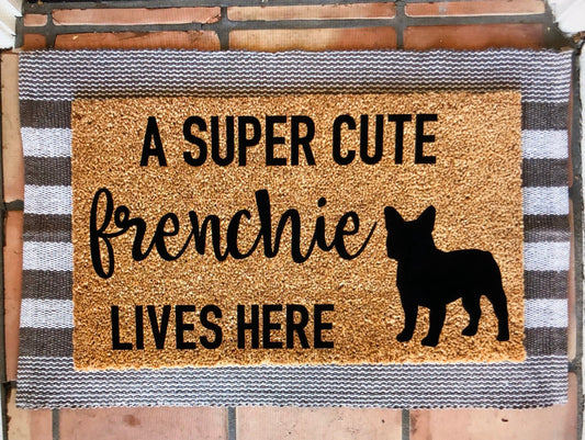 A super cute frenchie lives here, customizable pet doormat, cute doormat, funny doormat