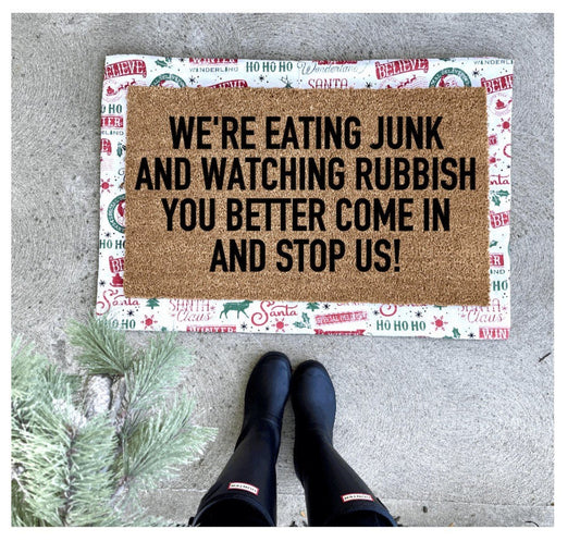 We’re eating junk and watching rubbish you better come in and stop me doormat, home alone doormat, Christmas doormat