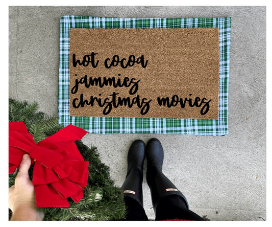 Christmas favorites hot cocoa, jammies, Christmas movies doormat, Christmas doormat, cute doormat