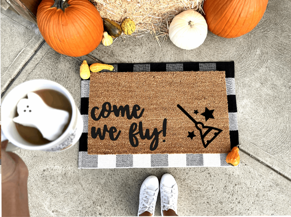 Come we fly doormat, funny doormat, witch doormat, Halloween doormat, fall doormat