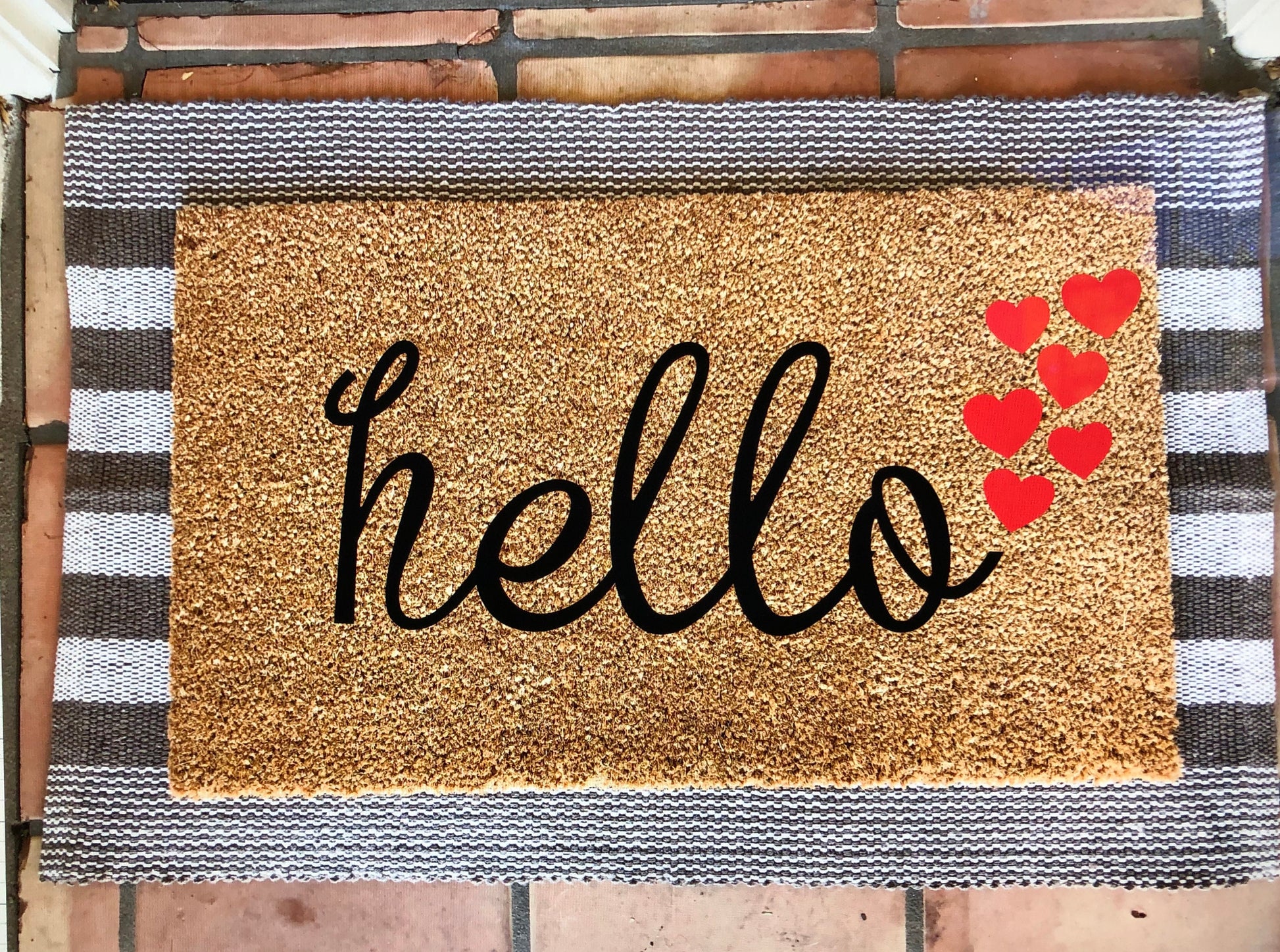 hello doormat with hearts, valentines day, cute doormat, valentines day mat, valentine, heart doormat, love doormat