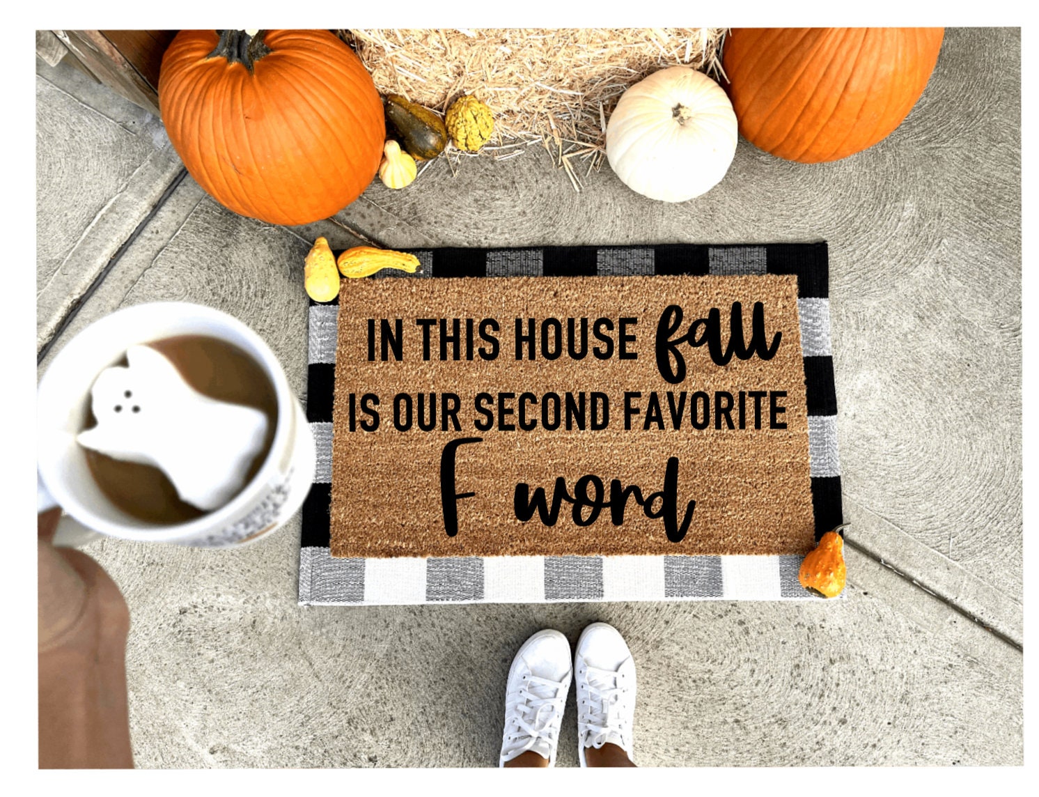In this house fall is my favorite f word doormat, funny doormat, fall doormat, Halloween doormat, boos and dog treats, cute doormat