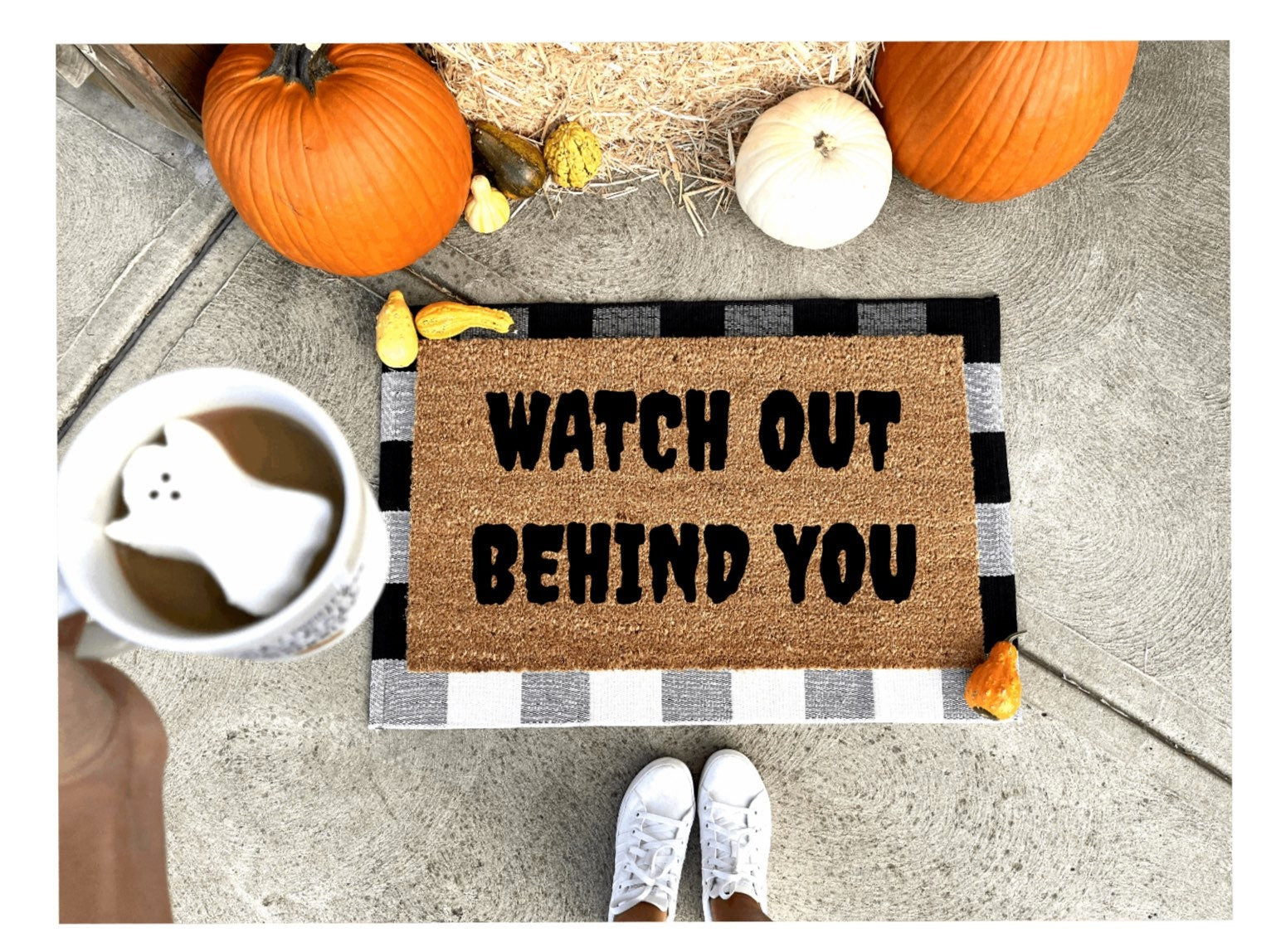 Watch out behind you doormat, funny doormat, witch doormat, Halloween doormat, fall doormat